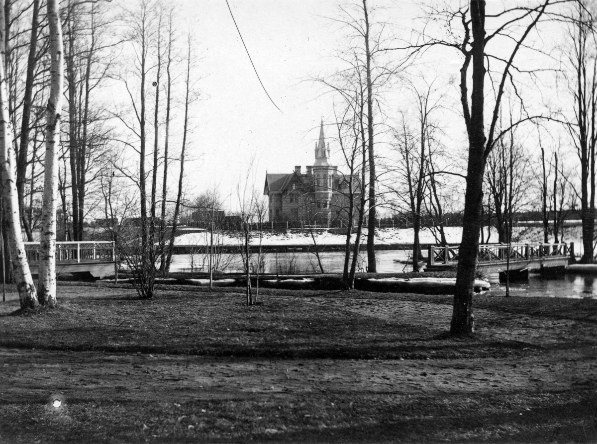 I bakgrunden Rettigska barnhemmet som uppfördes och invigdes 1881. Huset ritades av stadsarkitekten E.A. Hedin. Verksamheten upphörde 1955 och huset revs 1960 för att ge plats för Strömbadet.