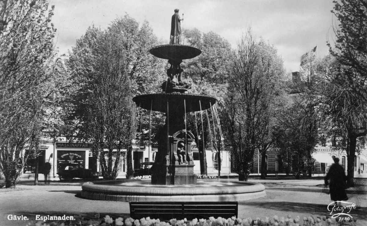 Fontänen intill Rådhustorget skapades 1880 av Carl Johan Dyfverman och kröns av drottning Kristina, Karl IX:s gemål som hade Gästrikland som sitt livgeding (förläning).