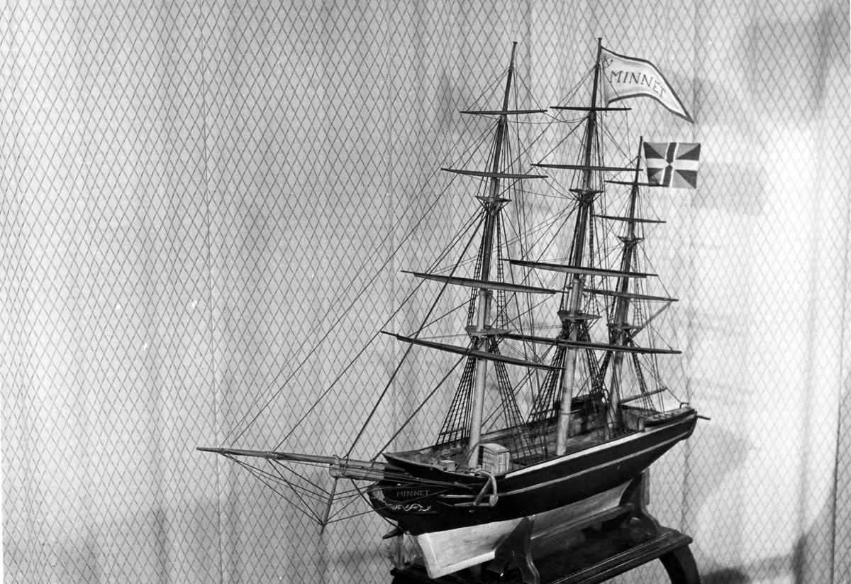 Modell av skeppet "Minnet". Skepp byggt av Gefle 1836, 249 sv. 143 nyläst, 493 ton. Redare: D. Elfstrand o Co Gefle.