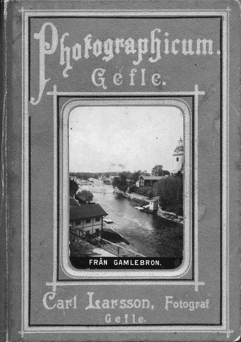 Photographicum. Omslagsbild på mapp innehållande 10 st fotografier med nio Gävlemotiv samt ett Älvkarlebymotiv.