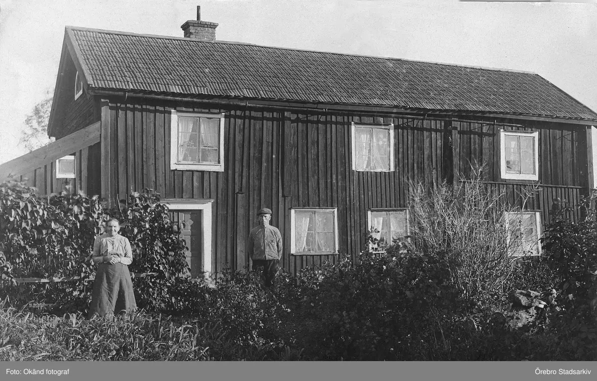 Paret Jonsson framför hus i Vivalla by, ca 1911