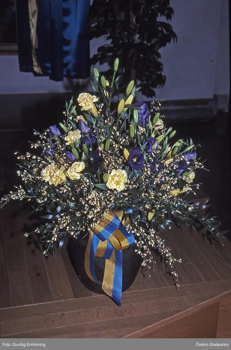 Blomsterarrangemang med blågult band, 1994