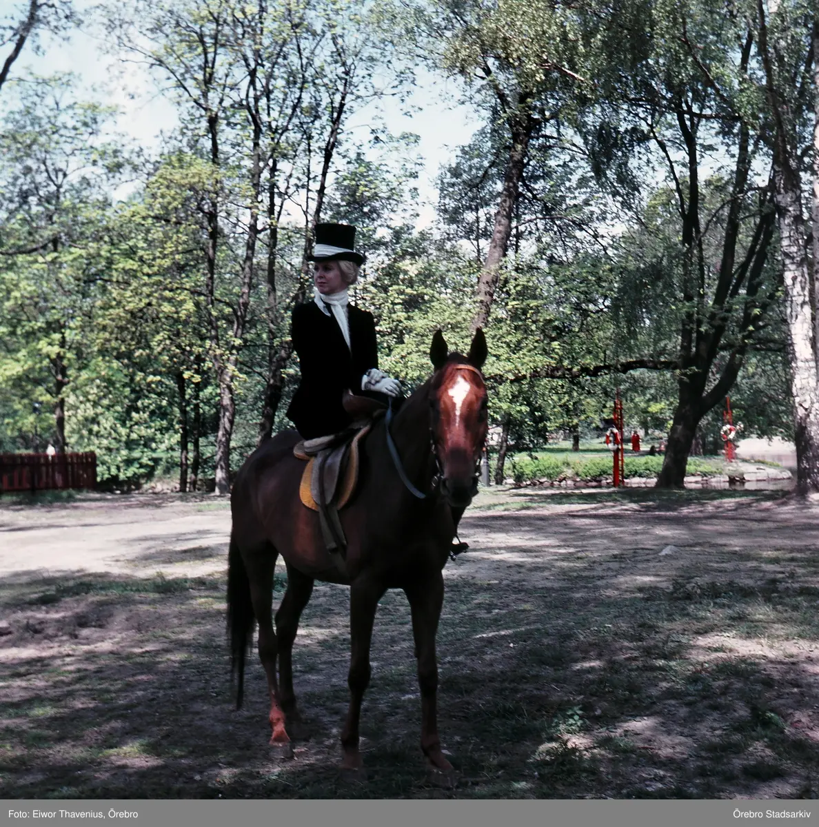 Skådespelare på häst vid TV-inspelning av Markurell i Wadköping, 1968