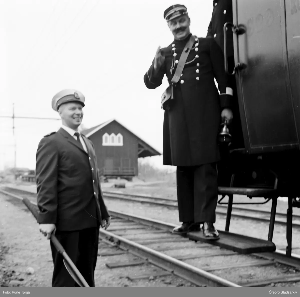 Kondoktör samtalar med stinsen på Kilsmo station, 1960-tal