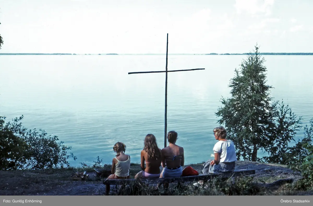 Besökare sitter på en udde, 1985