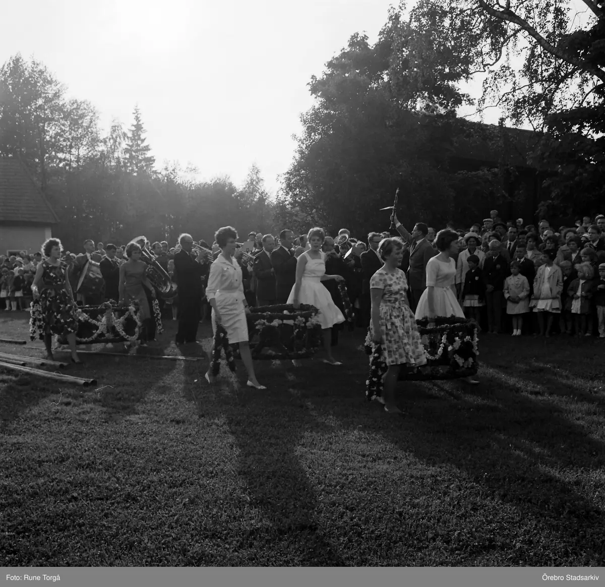 Flickor bär på midsommarkransar i Brevens bruk, 1960-tal