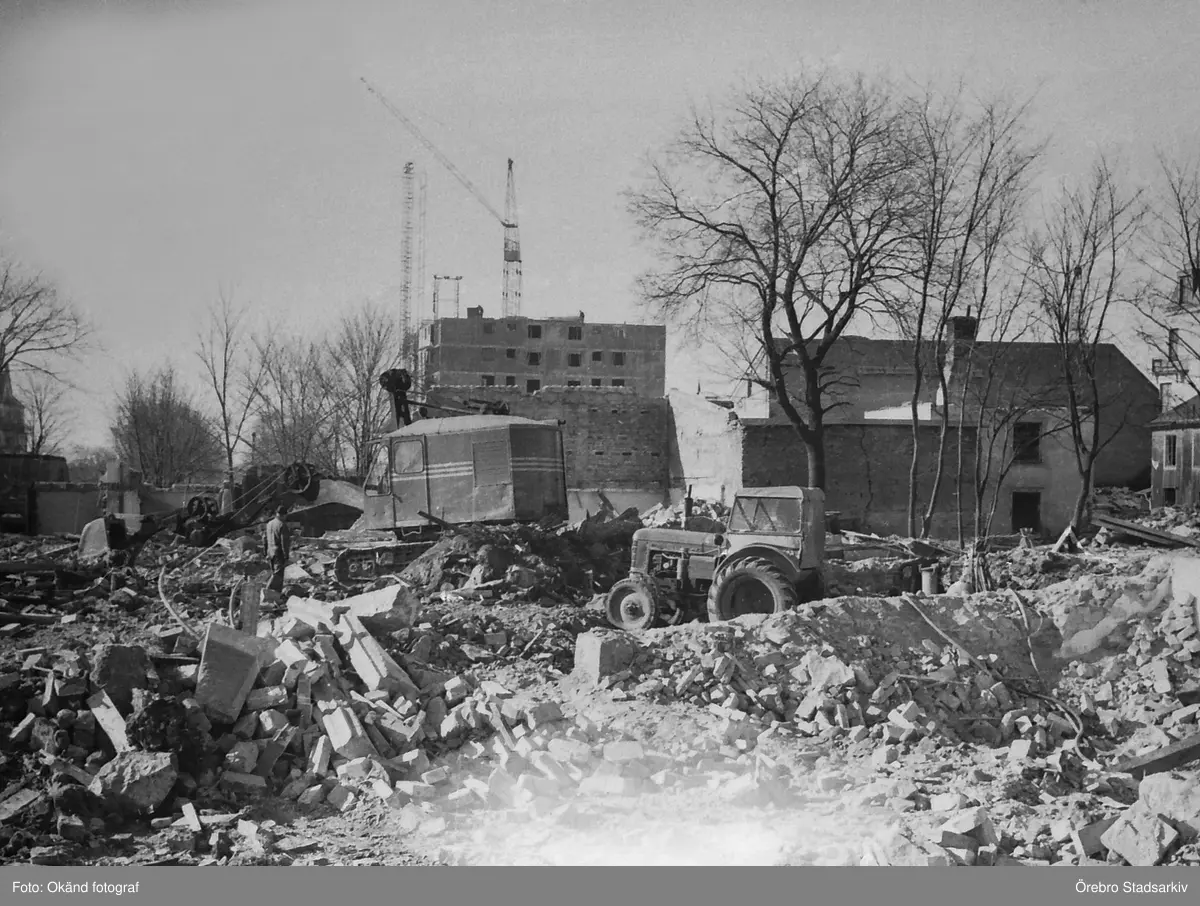Grävskopa och traktor vid rivning på Gamla söder, 1950-tal