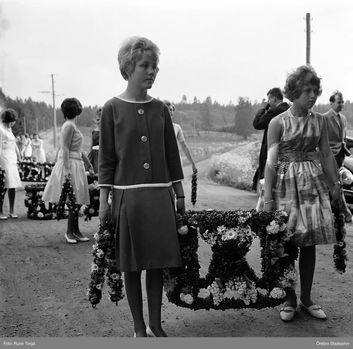 Flickor bär på kransar till midsommarstång i Brevens bruk, 1960-tal