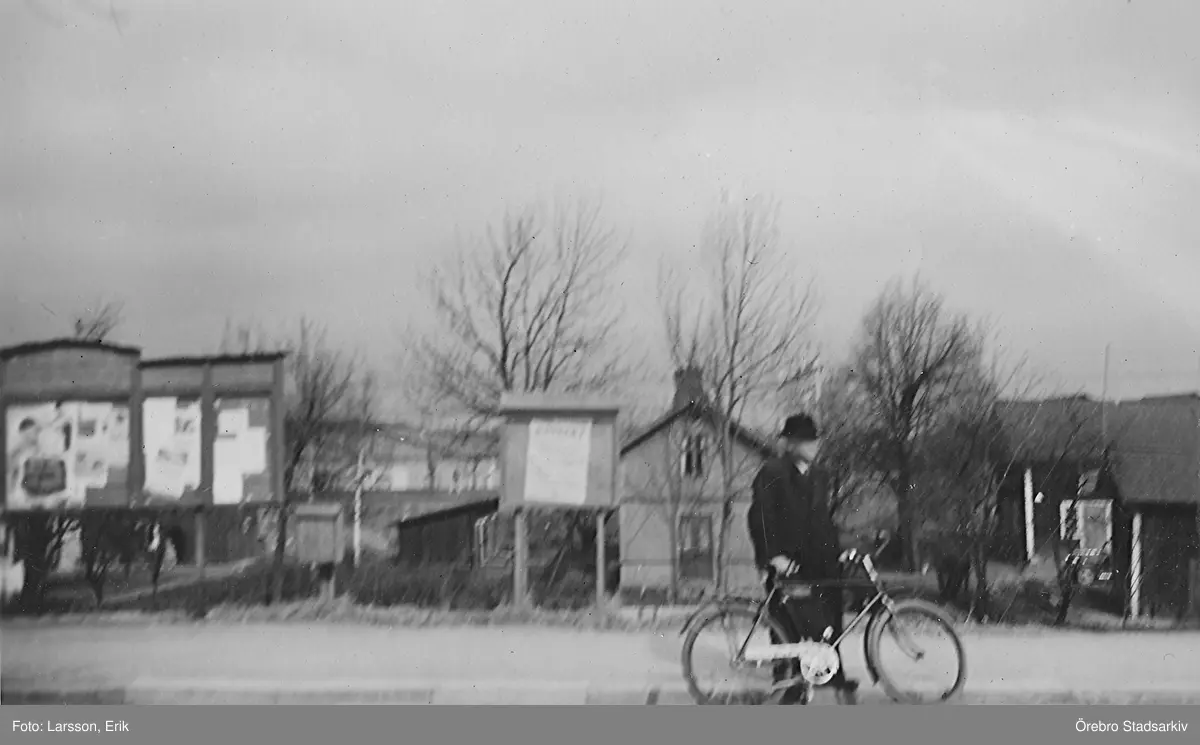 Man med cykel vid anslagstavla i Hallsberg, 1947