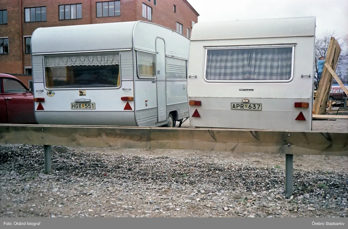 Husvagnar på parkering vid Kexfabriken på Ribbingsgatan 1-9, 1980-tal