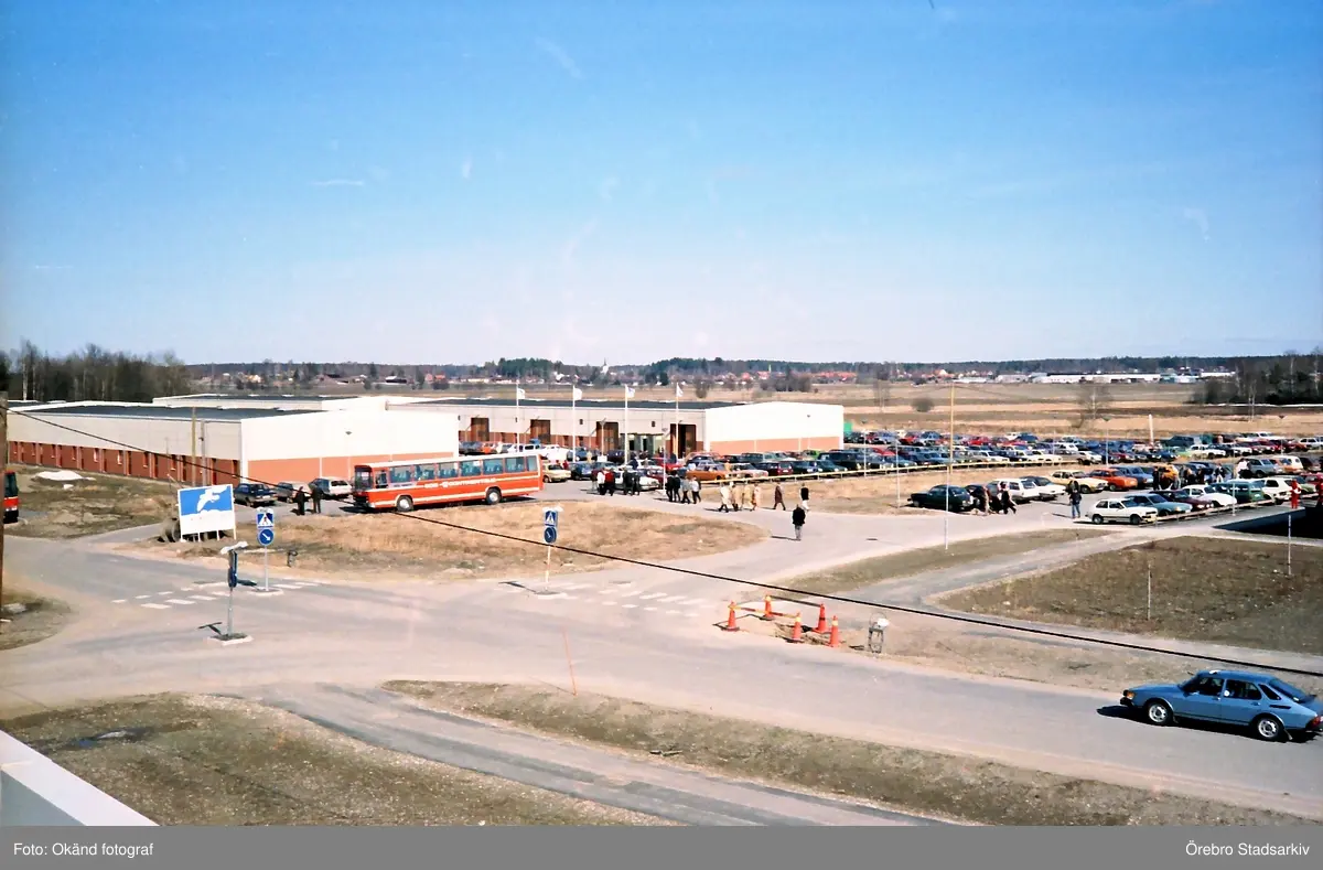 Besökare går mot MM- och veteranbilsmässa i Vivalla företagsby på Boglundsängen, 1982
