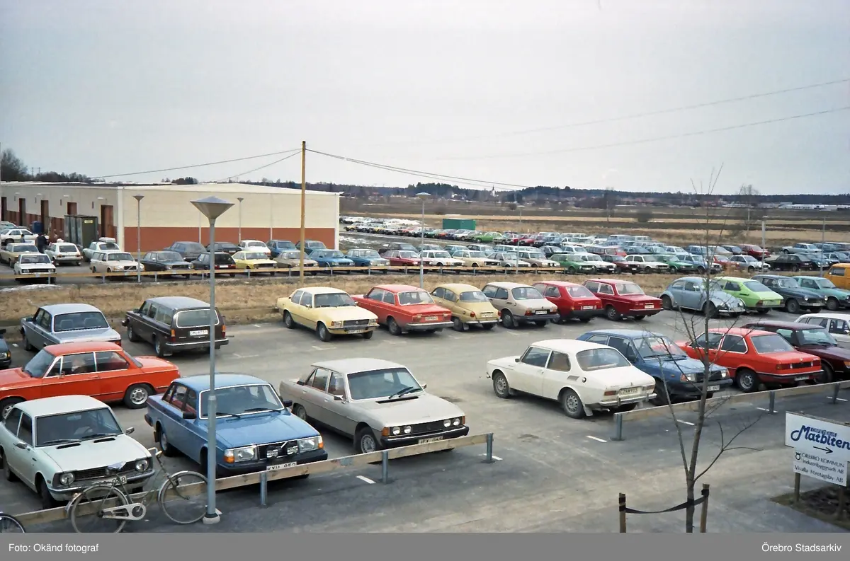 Parkering utanför MM- och veteranbilsmässa i Vivalla företagsby på Boglundsängen, 1982