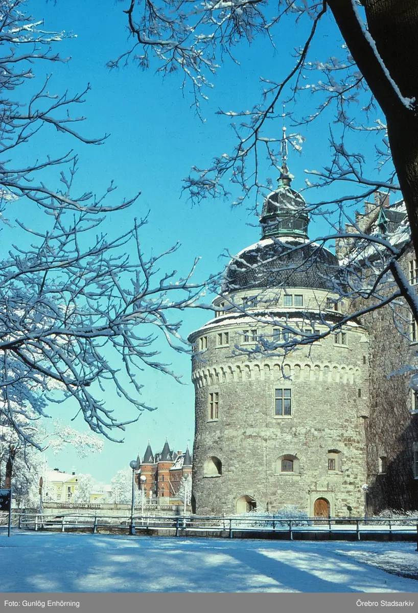 Sydvästra tornen på Örebro slott med snö på taken, 1982