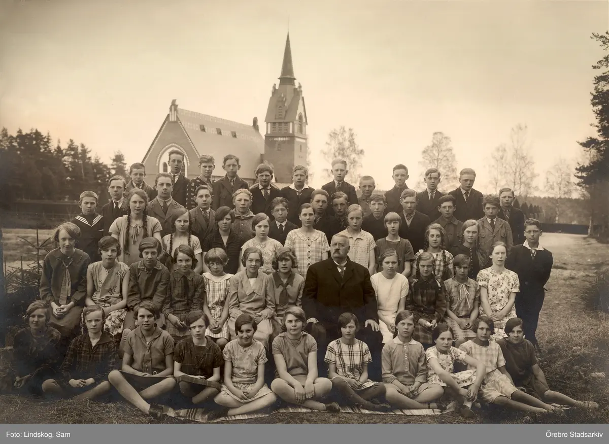 Prosten K A Waldén med skolklass vid Längbro kyrka, 1920-tal