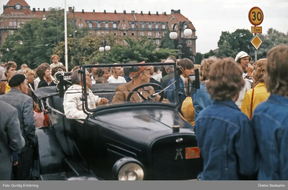 Marknadsbesökare i en veteranbil, 1980-tal