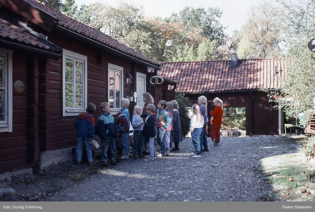 Skolklass på besök till skomakargården i Wadköping, 1989