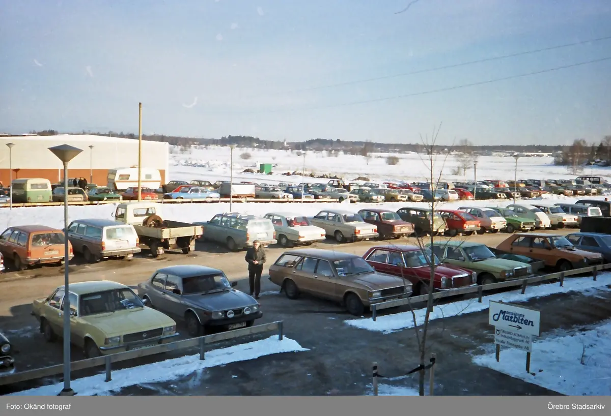 Besökarnas bilar på MM- och veteranbilsmässa i Vivalla företagsby på Boglundsängen, 1982