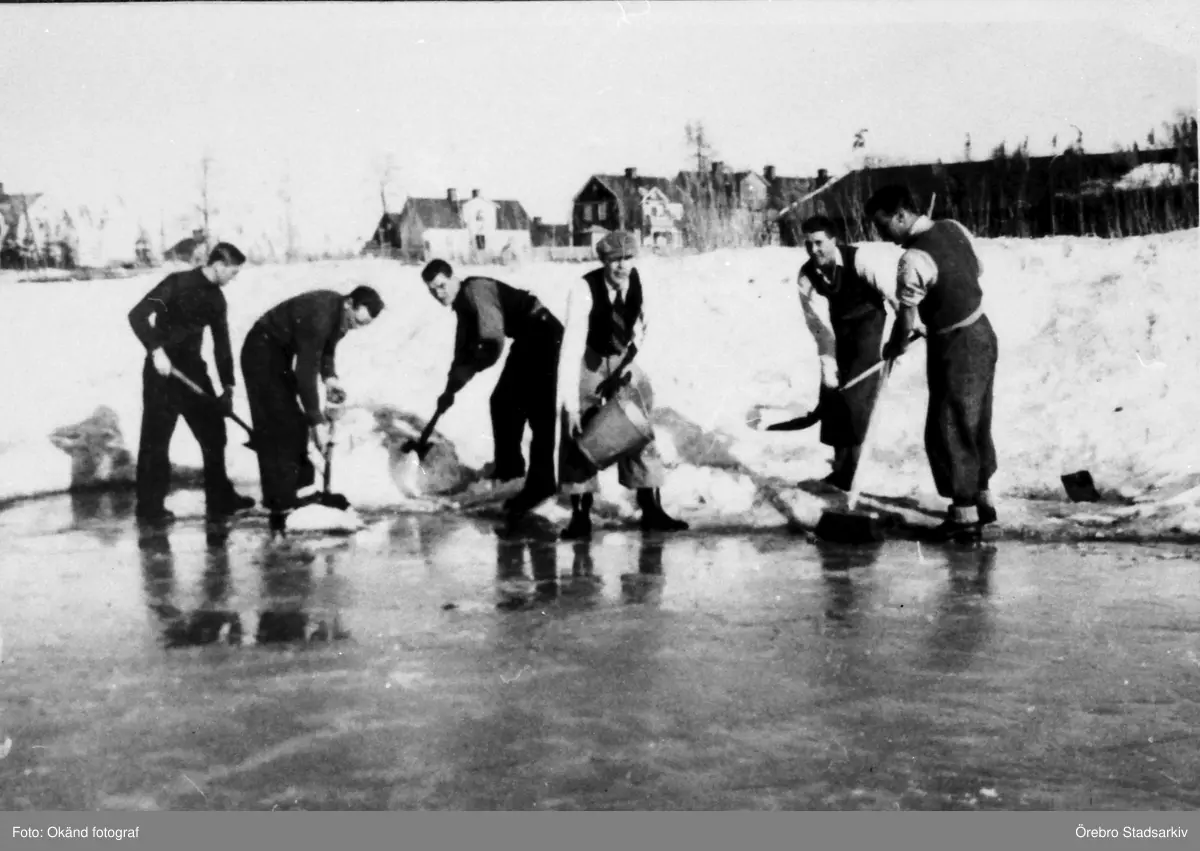 Reparation av sprickor i isen på Tegeldammen, 1936