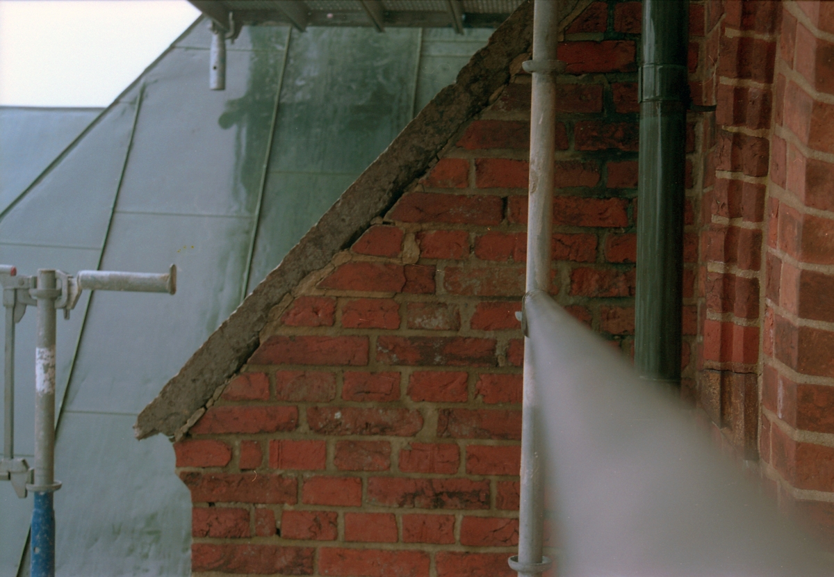 Trollhättans kyrka under pågående renovering, kontreforkrön, långhuset, NÖ:a hörnet
