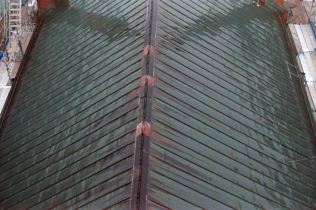 Trollhättans kyrka under pågående renovering, långhustaket sett från tornet