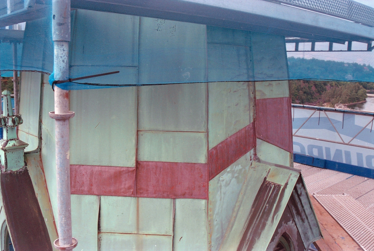 Trollhättans kyrka under ut- och inv renovering, tornspirans plåt, mot SV, ilagning, ny plåt