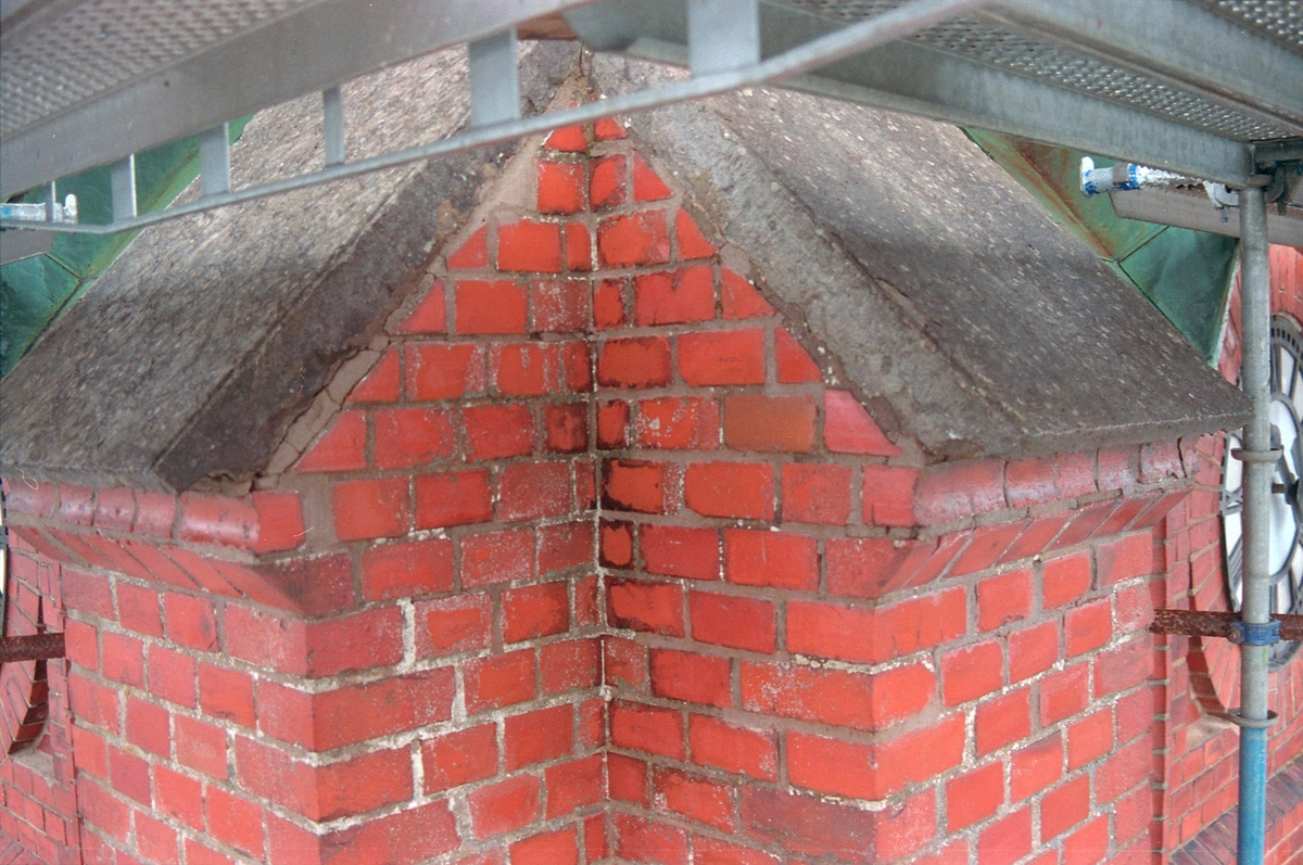 Trollhättans kyrka under pågående renovering, torn, kontrefor, täckning, SV:a hörnet