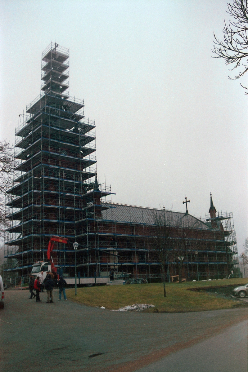 Trollhättans kyrka under pågående renovering, vy från SV, resta ställningar