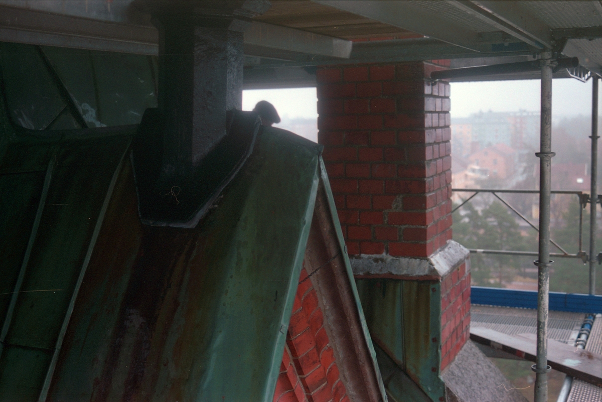 Trollhättans kyrka under pågående renovering, torntak, urvåning, västfasaden