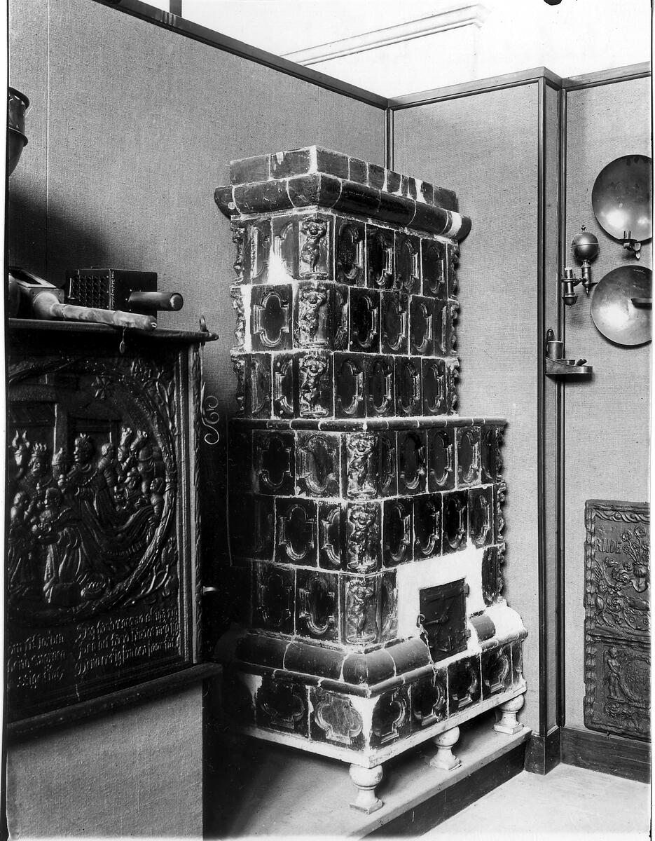 Kakelugn från Jakobsberg, Brännkyrka socken. Grönglaserad, omkring år 1700.