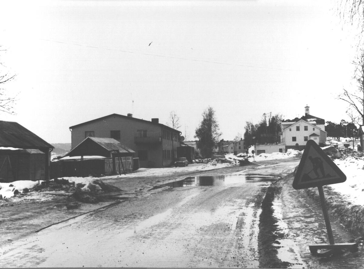 Infarten till Nylands centrum från norr. Nordlunds bilverkstad t.v. I bakgrunden tingshusets klocktorn.
