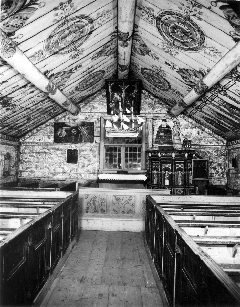 Väggmålning i Ulvö gamla kapell.; Fiskekapell timrat, panelklätt och rödmålat. Fristående klockställning. Rektangulär byggnad. Mycket rika vägg och takmålningar invändigt från 1719 av Roland Öberg. Bänkinredning 1771. (Ångermanlands äldsta fiskekapell)