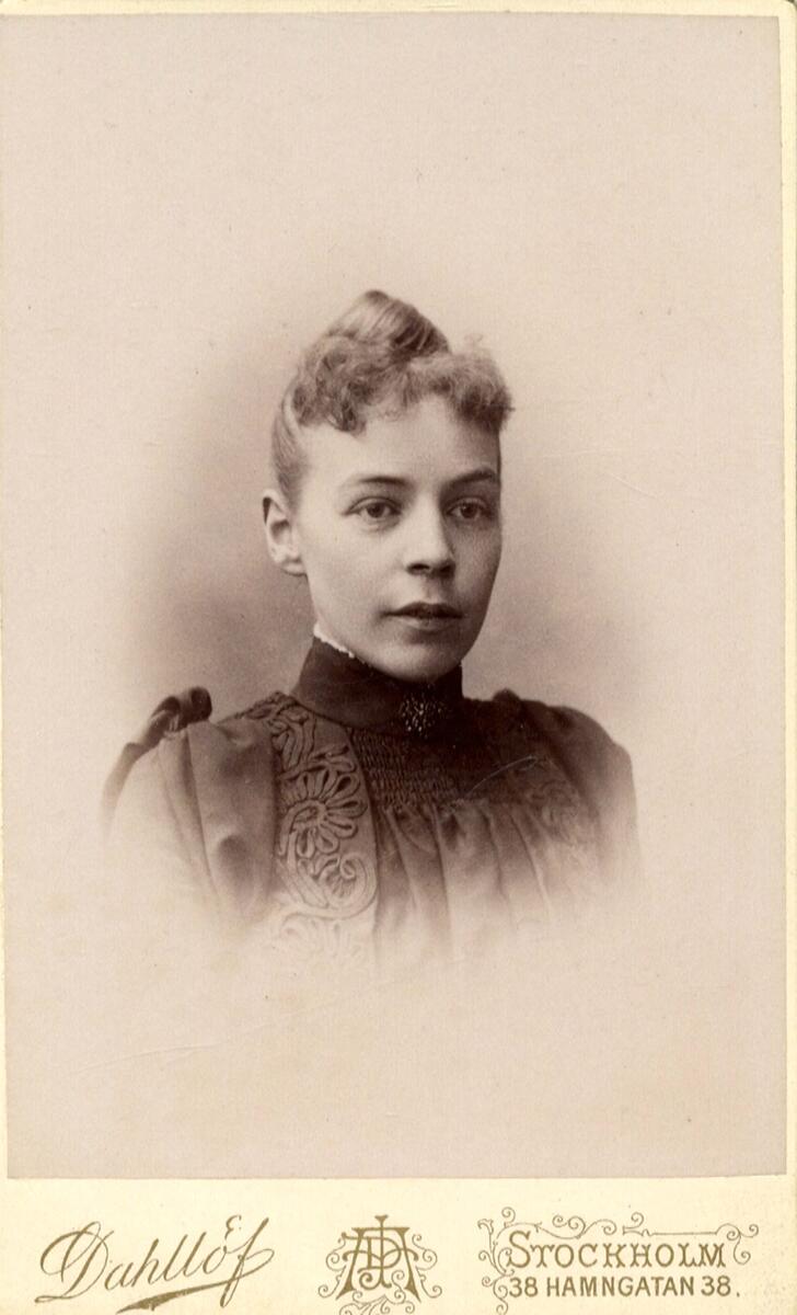 Fru K. Arnell. Alfr Dahllöf Hamngatan 38 Stockholm. Den 1:ste nästa oktober flyttas Ateliern till Drottninggatan 47, hörnet af Mäster Samuelsgatan.