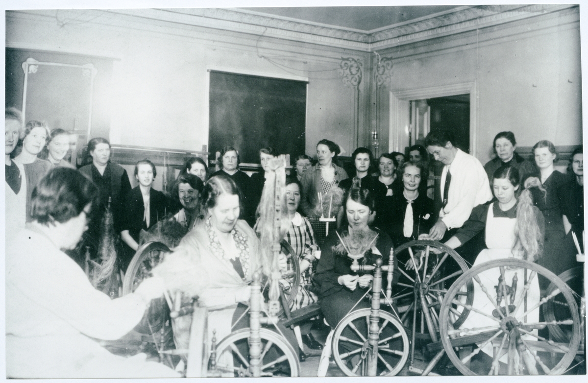 Bild från spånadsafton i Vettergrenska gården i Arboga hållen i samband med vävkurser åren 1937, 1938 och 1939. Olga Anderzon står upp (med vit skjorta).