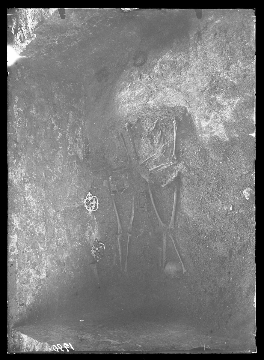 Lundby kyrka, Västerås. Utgrävning, murad grav med skelett.