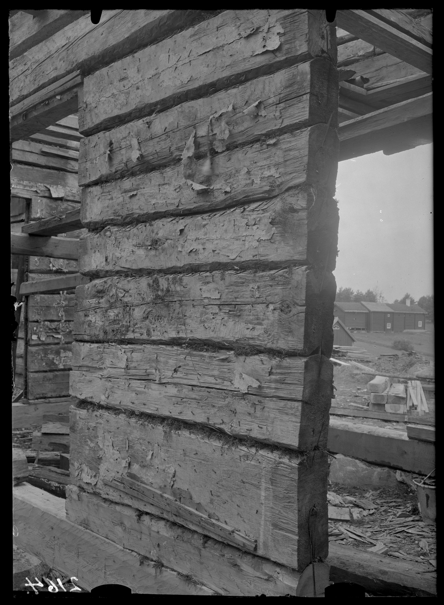 Mellanvägg, med spår av nyuppsågad dörr, Hallstahammars herrgård, efter flytten till Vallby friluftsmuseum i Västerås.