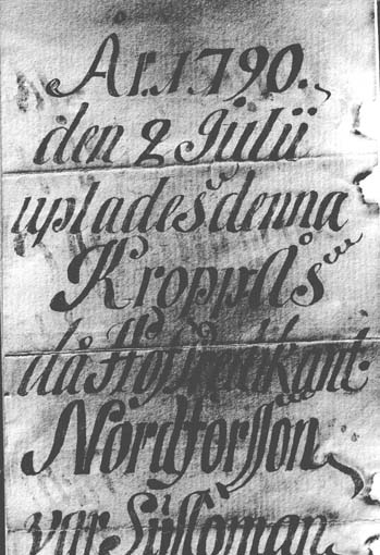 Kroppåsbrev daterat 1790. Från hospitalstomten, nuvarande kv Manfred, Västerås.