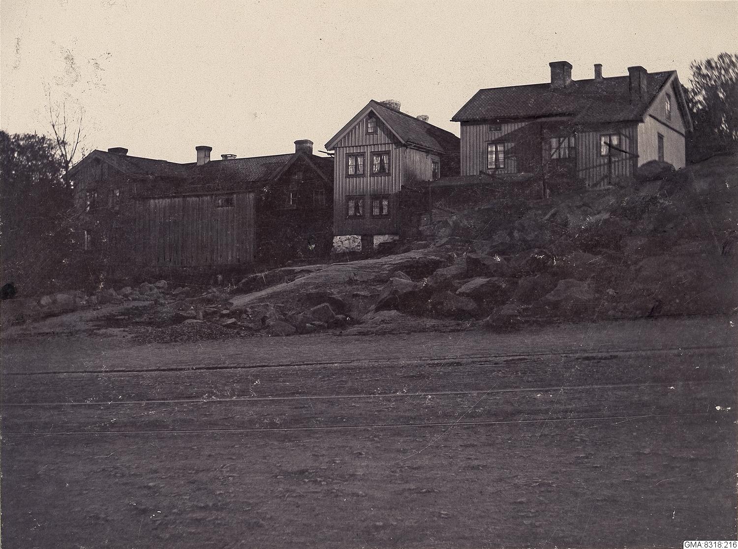 Allmänna vägen 51-57, äldre bostadshus på Ankareberget mitt emot Karl Johans kyrka. Husen revs ca 1920. Platsen gjordes om till Batajonsparken 1922