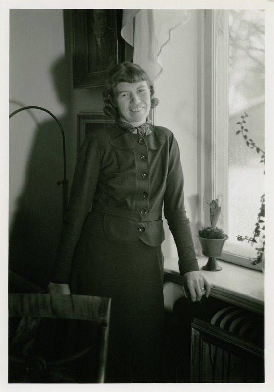 Fotografi föreställande Esther Gehlin stående vid ett fönster. Hon tittar på fotografen, och är iklädd en mörk dress och en scarf.