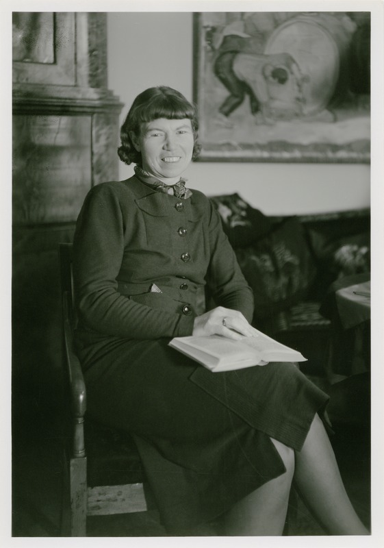 Fotografi föreställande Esther Gehlin som sitter på en stol med en öppen bok i knäet. Hon tittar på fotografen, och är iklädd en mörk dress och en scarf.