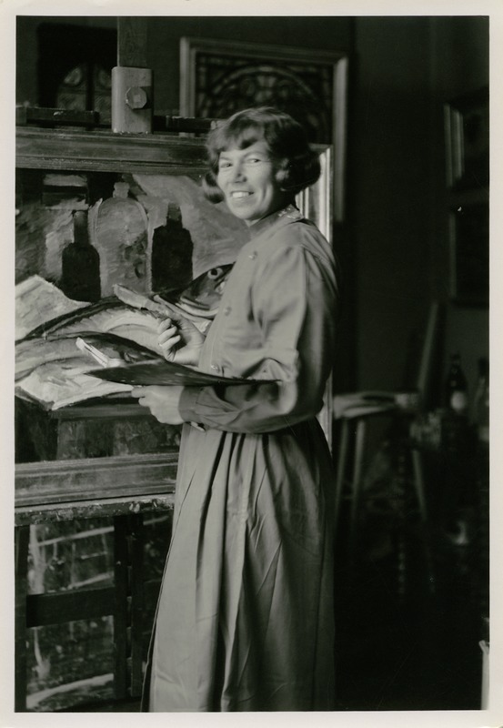 Fotografi föreställande Esther Gehlin som står och målar i en ateljé. Esther står med en pannå på ena armen och en pensel i andra handen, i profil men med huvudet riktad mot fotografen. Framför henne en målning stående på ett staffli.