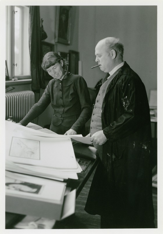 Fotografi föreställande Esther och Hugo Gehlin som står och tittar på mappar med konst. Esther iklädd mörk dress, Hugo i målarrock, under den har han skjorta och väst. Han röker en cigarr.
