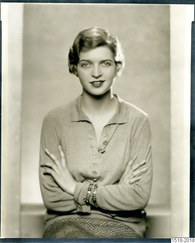 Fotografiet visar en ung kvinna som sitter i en fotoateljé. Hon är fotograferad rakt framifrån och tittar rakt in i kameran.