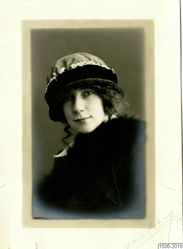 Ateljéporträtt av Karin Trapp/Ståhle. Hon är iklädd kappa med pälskant och hatt. Kartongen har blivit beskuren så att fotografiet ska passa i en ram, vilket gör att hela fotografnamnet inte är med - slutar på -berg.