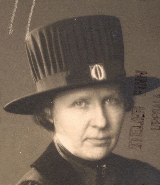 Svartvitt fotografi av Martha P:son iklädd doktorshatt, med mörk bakgrund,