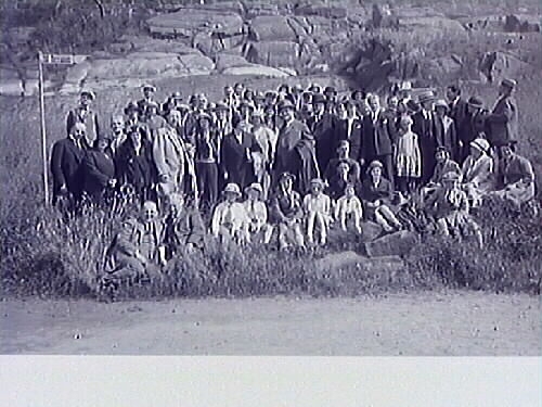 En mycket stor samling människor vid en skylt (till vänster) utmed Strandpromenaden som anger "Till terrassen", alltså fästningsterrassen i Varberg. I bakgrunden berg.