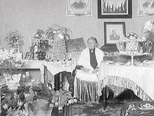 Apotekare Hultgrens fru Jenny firar födelsedag. hon sitter i salongen omgiven av blomster. Hennes sjal har liksom bordsduken långa fransar. Bostaden ligger i kv Apotekaren 8, hörnet av Torggatan-Drottninggatan.
