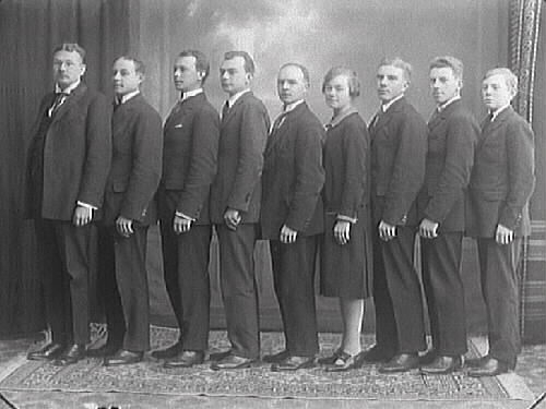 Stenhuggeriägare Eliasson står på rad med sina åtta barn, varav en dotter. Torpa, Tångaberg.