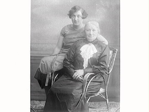Ateljéfoto av två kvinnor. Den äldre damen är fru Anna Friberg.