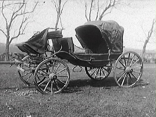 Fotografi av en gammal hästdragen passagerarvagn, en landå med sufflett, som står på tom utomhus.