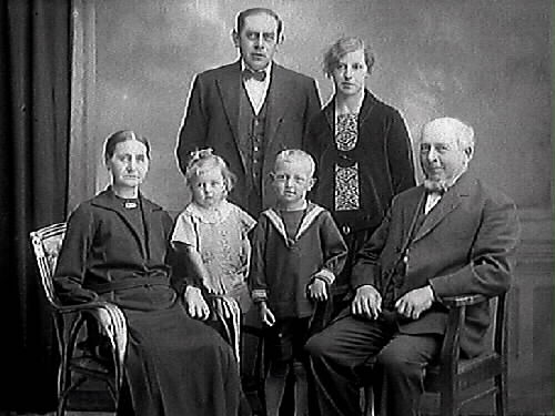 Familjebild. Familj från Träslöv. Kan möjligen vara tre generationer med det äldsta paret sittande, ett medelålders par stående och deras två barn.